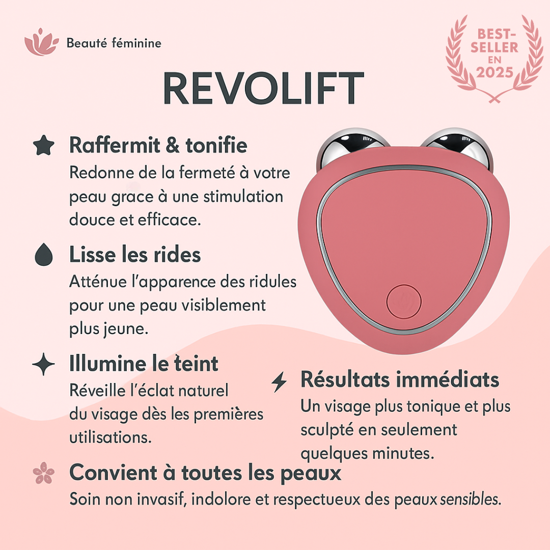 Revolift™ est un appareil de lifting instantané conçu pour raffermir la peau, lisser les traits et réduire l’apparence des rides en quelques minutes. Simple, doux et efficace, il transforme votre routine beauté dès la première utilisation.